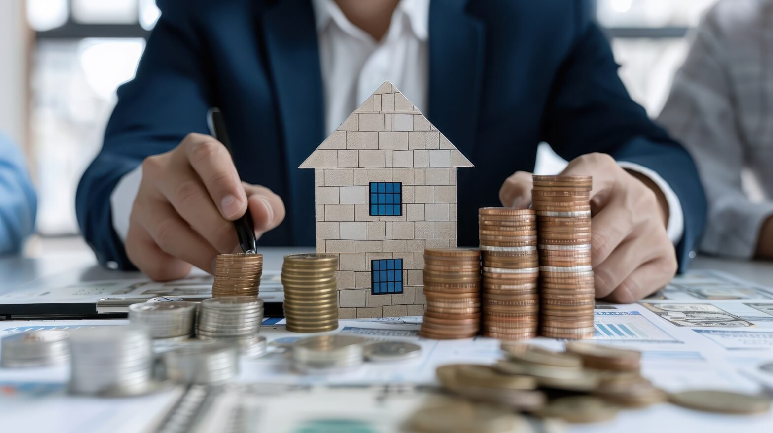 Close up of a house model with stacks of coins and financial documents representing the concept of investment real estate and financial planning
